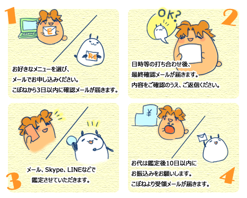 @お名前(鑑定及び振込確認のため、ご本名でお願いいたします) A生年月日(鑑定に使用します。難しい場合はご年齢だけお伝え下さい) Bオプションの有無 Cご希望の受け取り方法 D割引のご利用の有無 Eおまけのご希望(イメージワークorミニ占い) @〜Eをご記入の上、 mail:nemu-n○mail.goo.ne.jp まで (○を@に換えてお送りください) 件名「まるっと占い依頼」で お申し込みくださいませ。 |